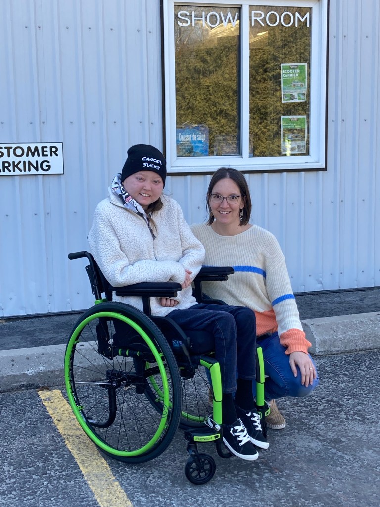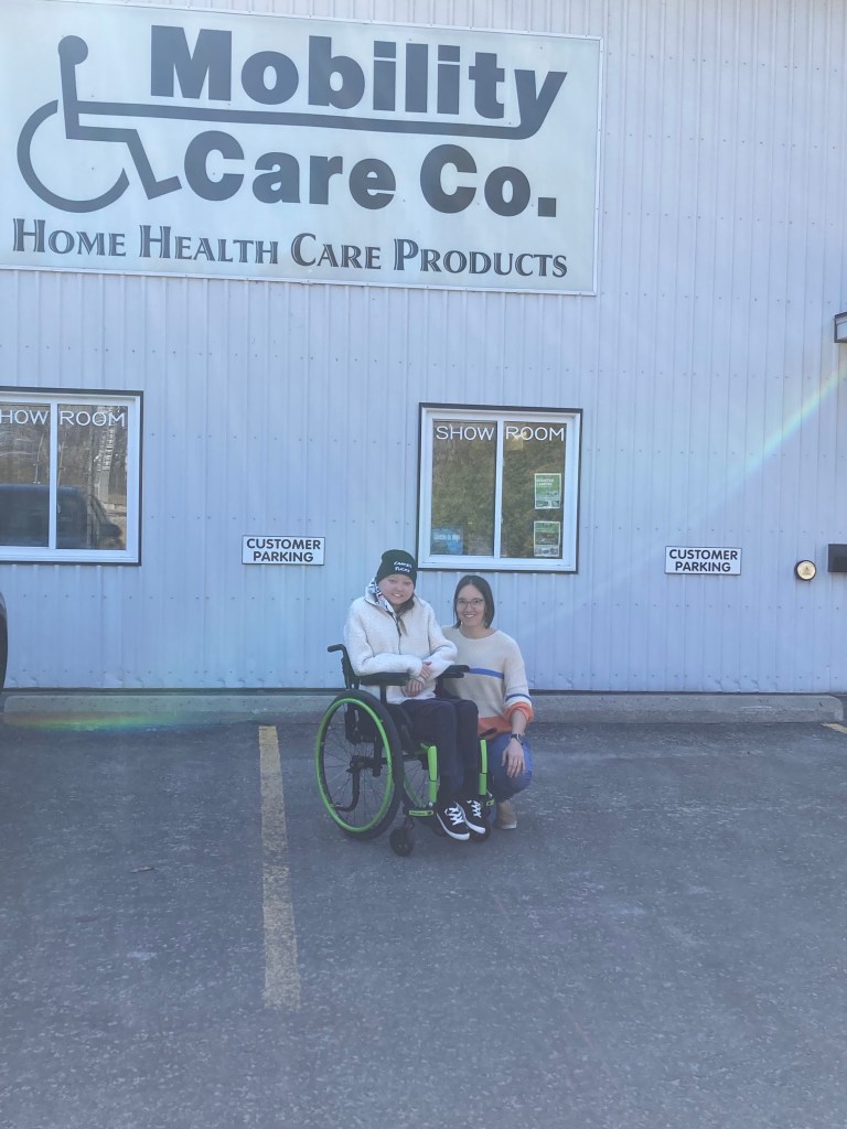 I want to give a special shout out to the people who made this happen. The first is the team at Mobility Care Co. in Perth – especially Peggy and Malcom. Without Malcom’s “macguyvering” there is no way this chair would exist. Every problem we came across he had an idea for solving. I would also like to thank my amazing occupational therapist Rebekka Rieder from Rebekka Rieder Occupational Therapy Services. She was the one who realized the chair I had wasn’t right for me and started the process for me to get a new one. She measured me and worked with me to create a chair I was safe in and that met my comfort level. She was there every step of the way to make sure it fit correctly.