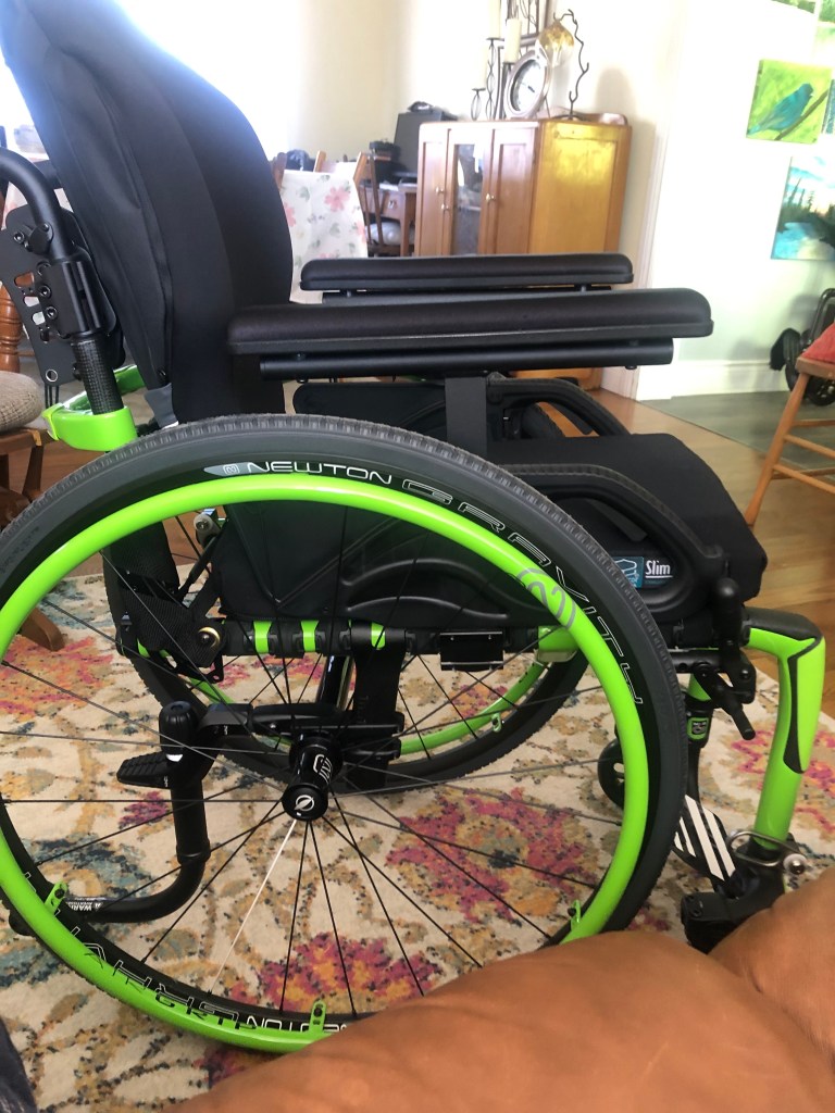 This custom chair fits me to a tee. It is only 20 inches wide, so I dare you to show me a doorway I won’t fit through. It is larger at the back (as I have more of an upper body) and it tapers down to fit my skinny legs. Felix is carbon fibre, so he is also very light. Including the wheels it weighs a mere 31 lbs! The best part, it is neon green! As opposed to the little bit of green I had on my old chair, even my rims are neon! It is a bit taller than I am used to, but I will adjust I’m sure. That feature comes in handy for transfers though! Much easier to go down than to go up.