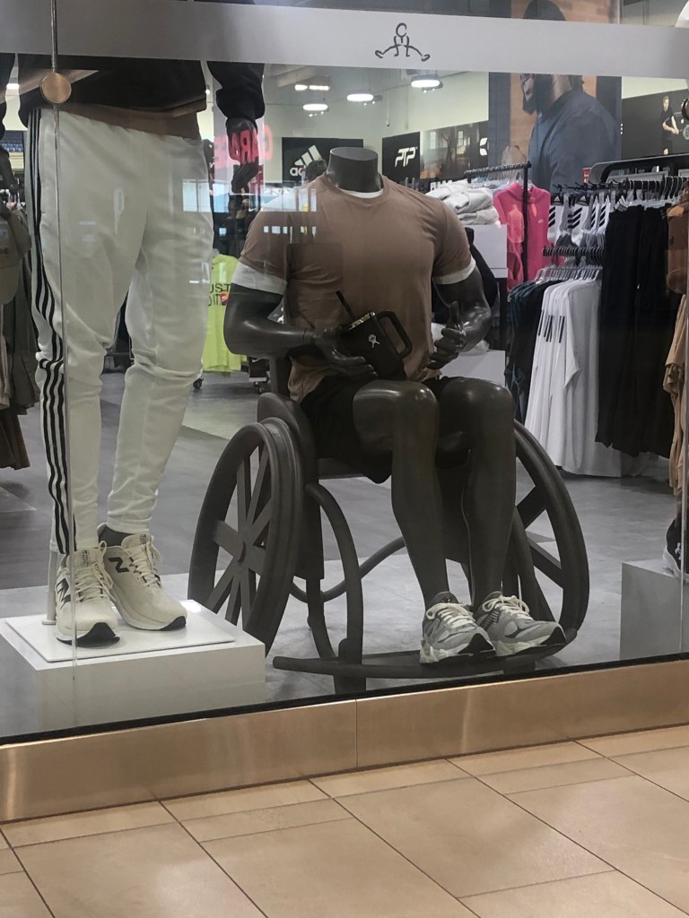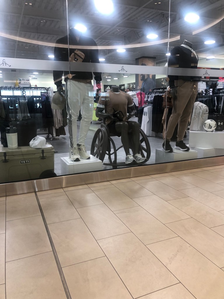I was in Bayshore Shopping Centre rolling along and saw this awesome mannequin! Loving the representation. Believe it or not disabled people shop too (lol). Like anyone, we want to see ourselves represented in the stores we shop at. We are customers too! This dapper guy was spotted at Sport Chek. I hope to see more of these mannequins in the future!