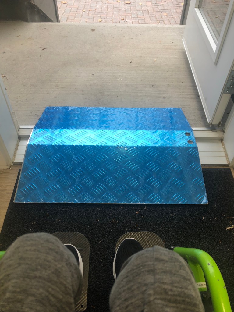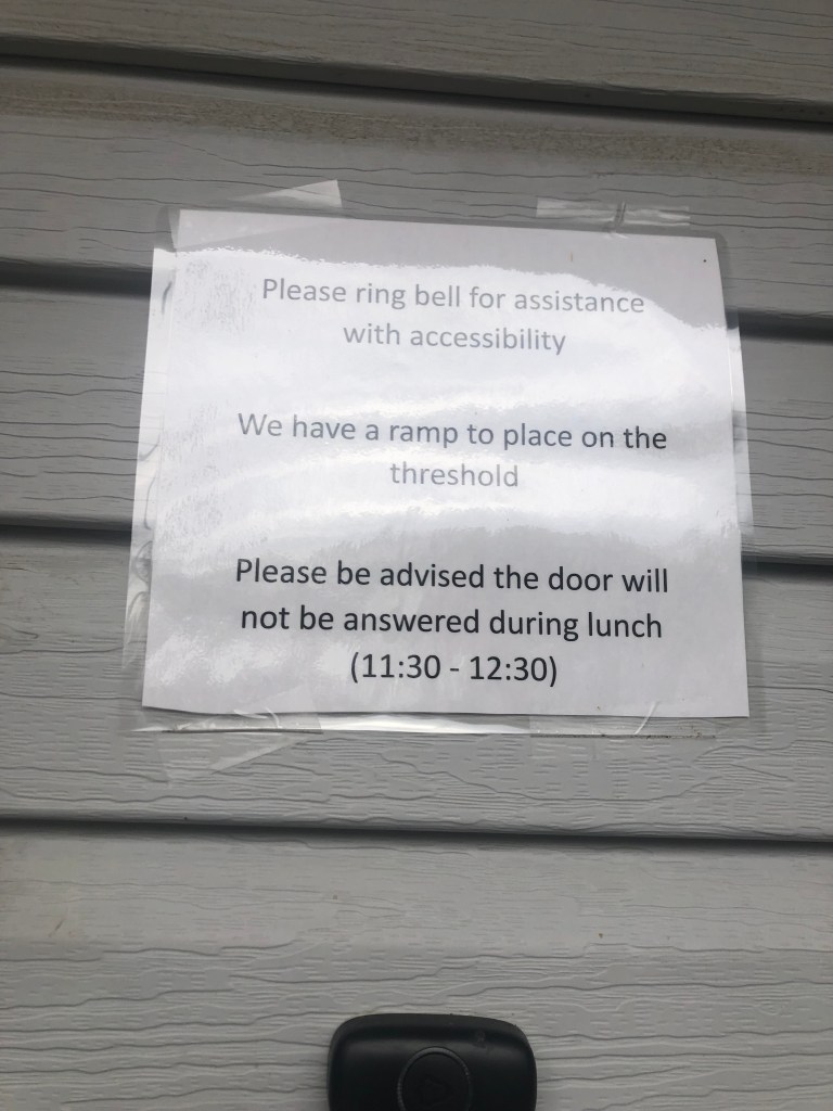 Merrickville Dentistry never cease to impress me! Check out the sign they had posted at their door at the top of the ramp. It says “Please ring bell for assistance with accessibility. We have a ramp to place on the threshold.” And then they showed me the threshold ramp they had had custom made. Way to go! It is little things like this that can make a world of difference for a wheelchair user. Few people realize what a barrier a threshold bump can be. Another seemingly small addition was the shoe horn that they had available to help people with their shoes and boots. Many don’t realize how difficult the act of putting these on can be for some people. It isn’t always easy to bend down that far. This little tool can have a big impact. So happy to see positive change in the village.